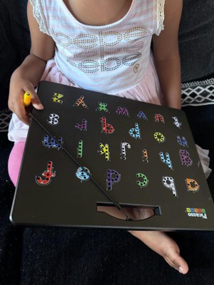 - QUICK CONNECT INTUITIVE PLAY - The large size 12x10 inch writing board comes with magnetized beads in the self-contained enclosure that allows the stylus pen (included) to quick connect, pick up, and bring the magnetic beads surface with an audible clicking sound to call visual learning to action to learn how to write capital letters on one side of the board and the lower case on the other side, with the sequence stroke and path direction instruction guide next to each alphabet character