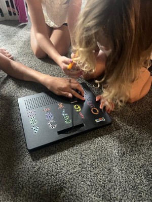 [This review was collected as part of a promotion.] I like the input it gives as you trace letters. I think that will be helpful to my daughter as she’s learning letters. The free space where you can draw is the most difficult to use, you need to use a lot of precision or you pull up a lot of extra balls, but the focus required to do that is good practice too!