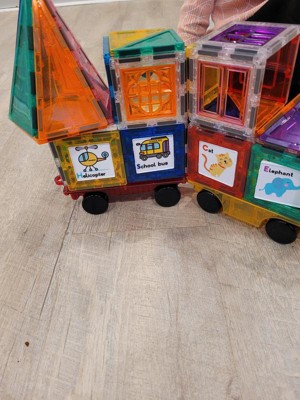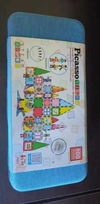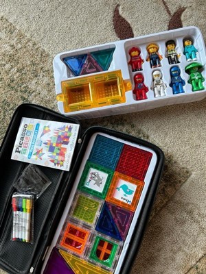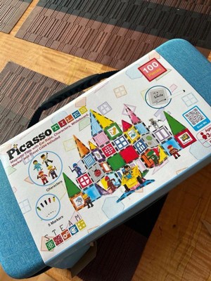 PICASSO-TILES 100PCS Magnet Tile Building Block Set with Carry Case, Car Base, 8 Magnetic Characters, Whiteboard Markers, STEM Educational Toy Age 3+