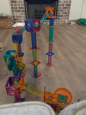 - BUILD YOUR BIGGEST IDEAS WITH MARBLE RUN MAGNETIC TILES - EMPOWER KIDS TO DREAM DESIGN AND DISCOVER: Contains 150 vibrant, colorful, translucent and magnetic piece building blocks and tiles that connect together intuitively to allow hand-eye coordination, motor skill training, and child brain development. Equipped with 10 different geometric shapes, including columns, slopes, slides, funnels, U-turns and steel-weighted marbles, the 3-D race track allows multi-layer designs that enable children to stimulate the imaginations