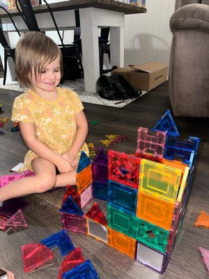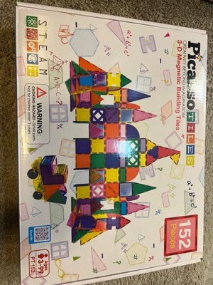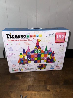 Picasso Tiles 152 piece Clear Magnetic Tiles Set. Between the ages of 0-5, the most critical time periods in child development. Picasso Tiles' products are here to help them grow through play. The 152 piece magnetic tile set will help children recognize the shapes and acquire a strong sense of color by building. Unlimited open-ended structures from a small car to a big castle. For ages 3+.