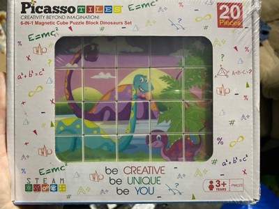 PicassoTiles 20 piece dinosaur magnetic cube puzzle playset (PMC23) will increase kids attention to detail, problem-solving and concentration skills by combining these brain teasing, magnetized 1a?? puzzle cubes together. The box includes 6 different dinosaur themed images so your child can make their own art work. Turn and spin to easily match the right piece to complete the masterpiece.