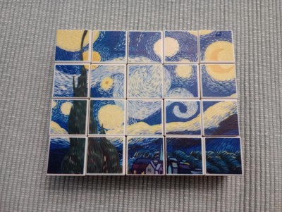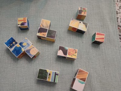 - FINE ART MATCHING CHALLENGE! Develop concentration & problem-solving by rotating cubes to complete masterpieces. Includes reference cards showing all 6 paintings. Magnets prevent frustration with secure "click" connections during play.