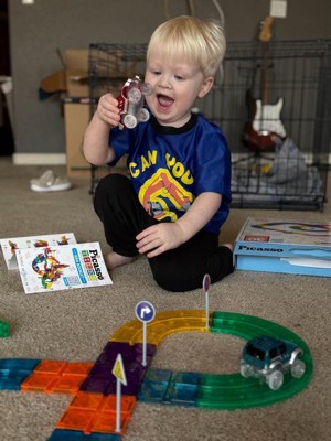 [This review was collected as part of a promotion.] I got this for my nephew and he had so much fun with it! The magnetic tiles are easy to snap together ,no need to align like regular car /train tracks and he loved building different race tracks. The battery powered trucks (red and blue) zoom around with lights looks so much fun, which made it even more exciting. It's a great mix of creativity and fun for younger kids too. Just a heads up, some of the small pieces like signs can be a bit fragile and the truck lights may stop working if the batteries run low quickly, so keep batteries in stock. Overall, I find it a fun and engaging set that keeps kids entertained and lets them build their own race world.