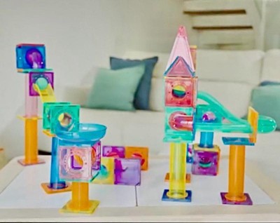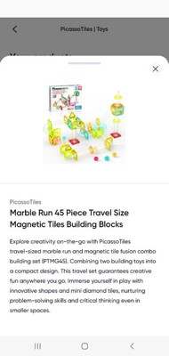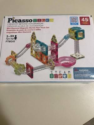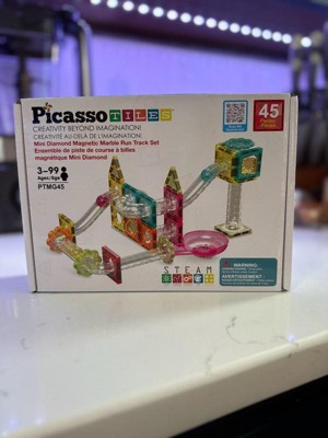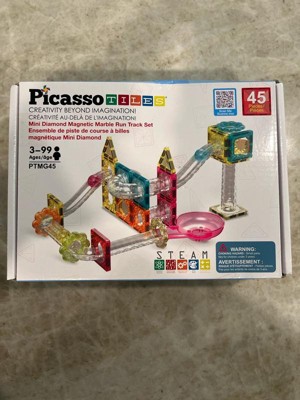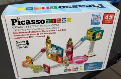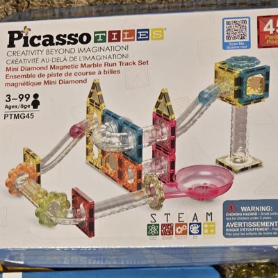 - BUILD YOUR BIGGEST IDEAS WITH MARBLE RUN MAGNETIC TILES - EMPOWER KIDS TO DREAM DESIGN AND DISCOVER:Infinite Possibilities, Expandable for Masterpiece Creations. The travel size magnetic marble run track building block toy includes 45 mini diamond tiles with a unique diamond reflection surface, complemented by marble run race pieces. Use it alone or combine with other PICASSO-TILES mini magnet sets for seamless integration, offering limitless construction potential