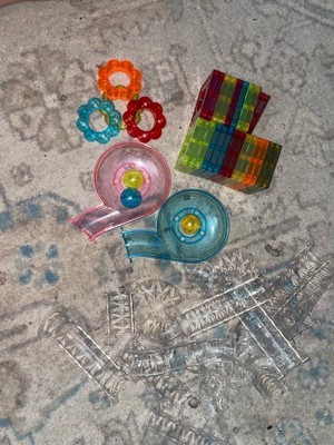[This review was collected as part of a promotion.] This was slightly difficult to figure out at first since there aren’t any directions- just picture ideas. But when we got it going, it was a lot of fun. The only thing is that the clear plastic “slides” are cheap plastic. It does make you want more so you can build something big and intricate. I do recommend these for some indoor fun.