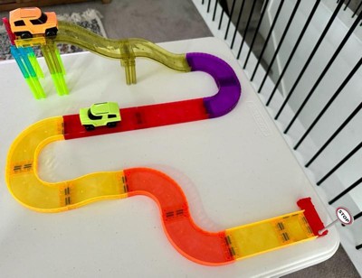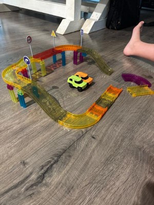 [This review was collected as part of a promotion.] This is a fun little race track. The track has sides so that the little car can drive around and this car is FAST! Like surprisingly (and comically) fast compared to how small the track is. I magnets on the track pieces work really well and I really like the stilts that hold the bridge pieces. Overall a great toy and my 3-year old has fun playing with it.