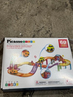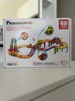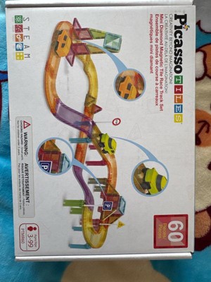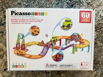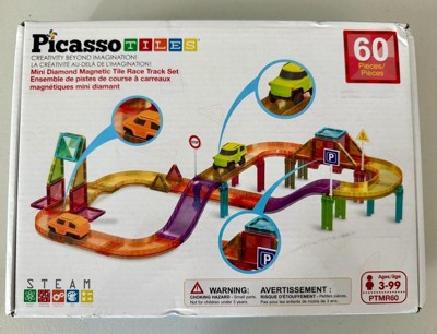 PICASSO-TILES Mini Magnetic Race Track Tiles for Kids – 60PCS STEM Construction Building Blocks Toy Set with Racing Car, Travel Size