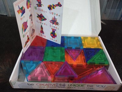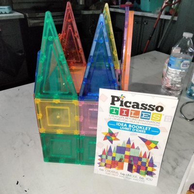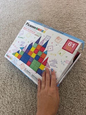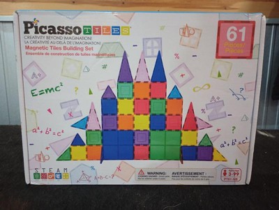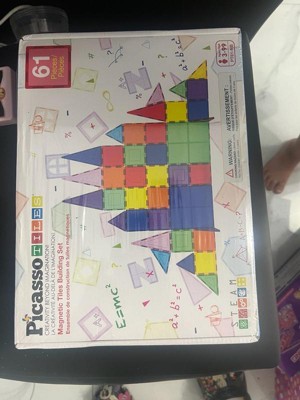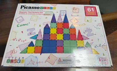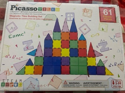 - PACKAGE INCLUDES: This 61-piece set contains a variety of magnetic tiles and building accessories to inspire limitless creativity. Inside, you’ll find 2 X Large Square, 6 X Tall Triangles, 25 X Medium Squares, 18 X Equilateral Triangle Module and 10 X Small Triangle. PICASSO-TILES STEM Building Blocks set perfect for creating everything from houses to castles and imaginative scenes.