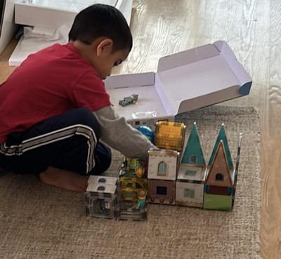 [This review was collected as part of a promotion.] These Picasso tiles were a huge hit with my kids. They spent hours playing and creating new things from castles, homes and anything that came to their imagination. You can follow the pattern in the booklet or create anything you like. I love how easy they are to pickup since they all come together because of the magnet. Even my 3 year old was so intrigued with these tiles and the mini figures.