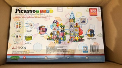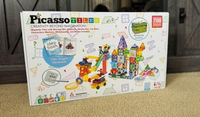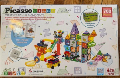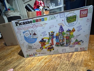 PICASSO-TILES 700PCS Marble Run Magnetic Tiles & Brick Combo, STEM Building Blocks Toy Set with Storage Bin, Ideabook & Action Figures for Kids