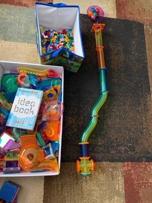 [This review was collected as part of a promotion.] My kid LOVES magnetic tiles and we already have 2 other sets so we were excited to add 700 more pieces but we are pretty disappointed because 500 of those are tiny legos and the rest are a lot of pipes and pipe parts. It’s more like a set for a young plumber. Again, because we have some magnetic tiles already, it works for us because we combined a few sets, but just one set consisting of mostly pipes and connectors would be very limiting. My kid is 4 and keeps asking for help when connecting those pipes. They are not magnetic and difficult to put together. Definitely not for kids 3+. The idea book is nice but it would be great to have spiral binding as it’s impossible to build something and keep it open. And most things that are shared in the book require different or additional sets. My kid kept asking to build something from the book, but my answer is always no, we can’t, we don’t have these parts… frustrating…