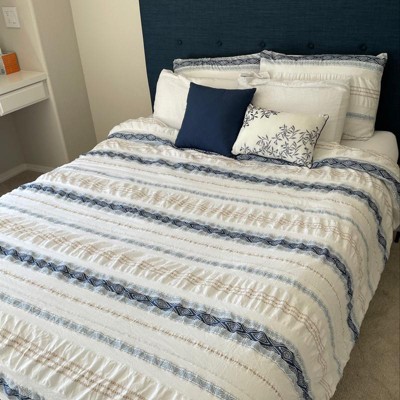 [This review was collected as part of a promotion.] I've been really impressed with the quality of this set and I love the crisp slightly boho design. The weave has cool little details and textures areas that show how high quality it is. After a few washes it still looks crisp and fresh and the design adds a nice pop in my bedroom.
