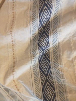[This review was collected as part of a promotion.] I am really pleased with this 3 piece duvet set. The fabric is really soft and feels nice to the touch. It appears to be stitched well-with no tears or loose strings. The design on the top is pretty with a tribal print and some feathering on the stitches that are white--this adds a really nice textured look to the duvet cover. The pillow cases are also nice and add an elegant look to complete the set. The buttons are easy to use and seem to be holding up to general use/wear. I have this over a down comforter and feel like it not only looks nice and elegant, but feels luxurious when using. I highly recommend this set.