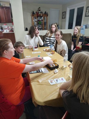 An action packed game with dice and cards and sports. We had ages 11-71 gathered.