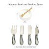 - INCLUDES a Ceramic Dip/Olive Bowl with bamboo spoon & 4 Stainless Steel Cheese Tools.