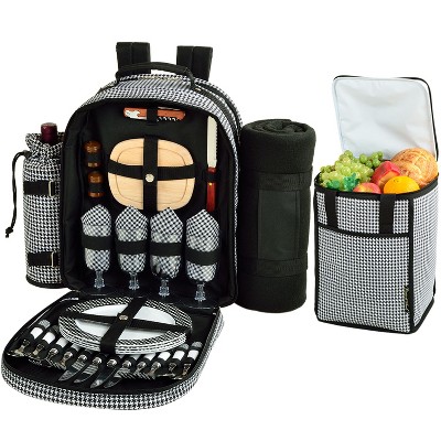 Upscale, Thermal Shield insulated picnic cooler with service for four on wheels. Unique, waterproof, divided cooler compartment has a leak proof, heat sealed, food safe PEVA lining. Cooler will keep food and drinks cold for hours. Interior measures 17.5" W x 10" H x 11.5" D and the bottle divider is removable when not needed. Includes: (4) coordinating 9" melamine plates, (4) 13" x 13" cotton napkins, (4) sets of top quality stainless steel flatware /ABS handles (fork, knife, spoon), (4) 8 oz. acrylic beverage glasses, (1) 6" x 5.5" x 0.75" hardwood cutting board, (1) 8" cheese knife, (1) combination corkscrew/bottle opener, (1 Set) wooden spill proof salt and pepper shakers with non-spill tops, (1) Removable wheeled cart. Easy access panel on top for drink storage. Adjustable/removable shoulder strap and comfortable hand grip, additional external pockets. Wheeled cart has a retractable handle and is simple to remove when not needed. Cart adjusts to 40" tall with handle extended. Outer measurements: 18" L x 13" D x 13" H. Plates, glasses, and flatware are dishwasher safe. This is a great picnic set for outdoor concerts or tailgating