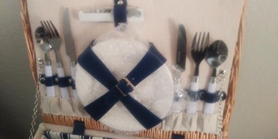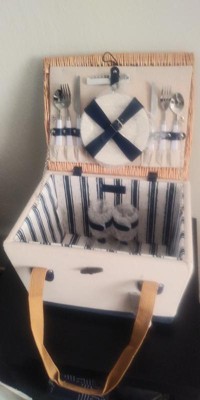 [This review was collected as part of a promotion.] This Picnic Basket is an interesting design. The outside of the Picnic basket has a woven Lid to it. The woven lid did have some pieces that should have been cut off because it was slightly sticking out of the top. The top does have a band to open and close the basket. When the Basket Lid is open It has Two Saucers in cased by a belt like strap, and a Spoon,Fork, and a Knife that are in slots. Which it's easy to pull them in and out of them. It also has a Cork Screw at the top for Beverage Bottles to be easy to open them. Inside the Basket it has a Blue and White stripe lining. At the Bottom it has two enclosures for two Wine Glasses. They came with Plastic wine Glasses which were cute and can be held into place by a strap at the top and one at the bottom of the cups so they stay in place when traveling with the appetizers as well as beverages. The outside of the basket also has fabric to match it but I think that the fabric can possible end up being stained if it's not being taken care of in the best fashion. The handles are easy to carry. I like it but just wish there were somethings that would have been a little different.