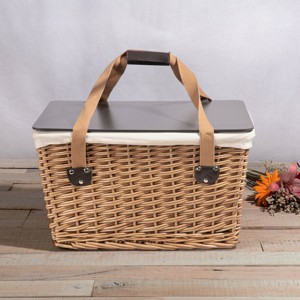 [This review was collected as part of a promotion.] A larger sized wicker picnic basket that not only is attractive but has a hard top which is perfect as a serving tray. It seems sturdy as it was packed with food and serving supplies for four people when we first used it. Love that the liner can be washed if necessary. The hard top could fit a bit more snugly. Pretty enough to leave out for show especially since you can use chalk and decorate the hard top however you'd like.