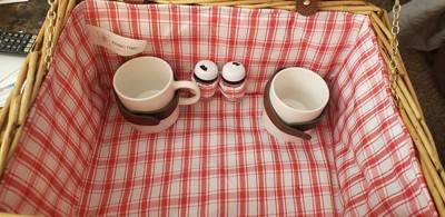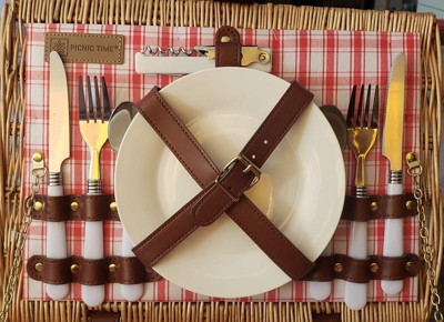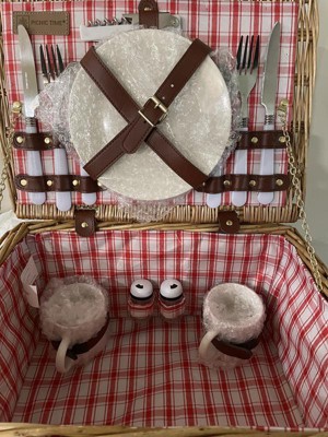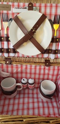 - Contains 1 handwoven picnic basket, 2 plates, 2 mugs, 2 half tang forks, 2 half tang knives, 2 half tang spoons, 1 stainless steel waiter corkscrew, 1 salt shaker, 1 pepper shaker