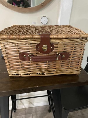 [This review was collected as part of a promotion.] Now that the weather is starting to get warmer, I can see using this picnic basket quite often. This comes with everything you need, minus a cute blanket, to have a stylish outing in a park. The basket itself it woven willow, definitely sturdy. The handles and straps are a beautiful brown leather and keeps the utensils in place. The basket is carried like a suitcase, comfortable grip and light weight while empty. The interior of the basket is deep, room for whatever you decide is a good choice for your picnic. Even has a bottle opener! This basket is really cute!