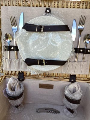 - ALL INCLUSIVE PICNIC SET - This classic picnic basket with lid includes 2 porcelain plates, 2 sets of stainless steel flatware, 2 wine glasses, 2 fabric napkins, and a stainless steel waiter's corkscrew