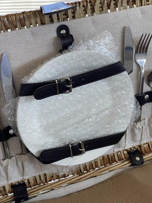 [This review was collected as part of a promotion.] Beautiful classic picnic basket. Love the woven design and faux leather accents. The interior lined with beige linen gives it a nice touch. This picnic basket came packaged and protected from damage. The basket is lightweight and sturdy. It came with 2 porcelain plates, 2 wine glasses, 2 linen napkins, and SS waiter-style corkscrew - everything you need for a special time for two.