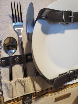 [This review was collected as part of a promotion.] I was thrilled to open the Picnic Time Classic picnic basket and find all the nice picnic items inside. There are two place settings along with wine/bottle opener. The plates are a nice ceramic, the silverware is metal. Everything is fastened either with Velcro, or snaps to keep it snug. There is enough room for food, drinks, a blanket, etc. The basket itself is a thick wicker and the inside has lining. The straps are a leather type material and closes with a twist very easy. I am looking forward to some nice relaxing picnics in the future.