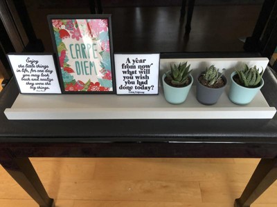 Love photo ledges. The light grey is neutral and the the simple shape is modern. I like that it's wide enough to set a plant or other decorative item in addition to photo frames or books. Love that it is easy to hang because you can see where you can see the holes for screwing it into the wall and can easily level it.