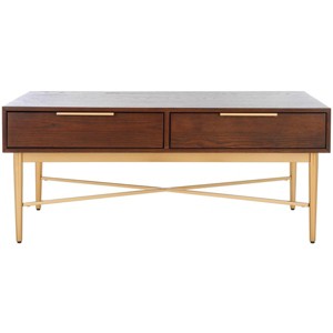 Embrace a refined and polished centerpiece for your home with our Pierre coffee table. The streamlined profile and luxe materiality of our coffee table lend an elegant and elevated look to any room. It features a sleek rectangular tabletop that is enriched with an oak veneer in a deep walnut brown hue. Perched upon gleaming gold metallic legs, our coffee table embraces a perfect touch of glam. It includes two drawers to keep all your knick-knacks organized and within easy reach.