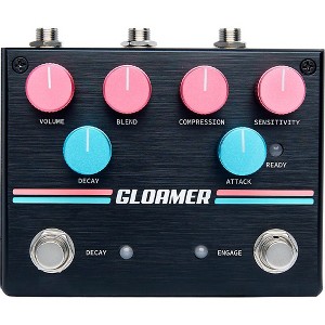 The Pigtronix Gloamer effects pedal is an all-analog, polyphonic amplitude synthesizer that alters the attack and decay time of any sound source without sacrificing the fidelity of the original tone. Its attack function provides a pick-triggered volume swell: a cinematic “slow gear” effect that is smooth and controllable with variable timing from extremely fast to very slow. The volume swell cycle can be reset at any moment by muting, allowing to craft bowed string-like lines and chords with ease.The Gloamer also features a powerful optical compressor that can add subtle punch or extreme sustain, helping to maintain a smooth volume swell effect even with very long attack times. A Volume knob controls loudness at the peak of the attack cycle, while a master Blend control allows to layer an uncompressed clean sound in with the volume swell effect. Additionally, when activated, the Decay function causes notes to fade out once the attack cycle is complete. When the decay cycle is completed, an auto-reset function causes the attack to begin again immediately, as long as there is audio input. This allows to create a wide range of undulating, asymmetrical tremolos at slower settings as well as pulsating stutter effects when using faster attack and decay times.