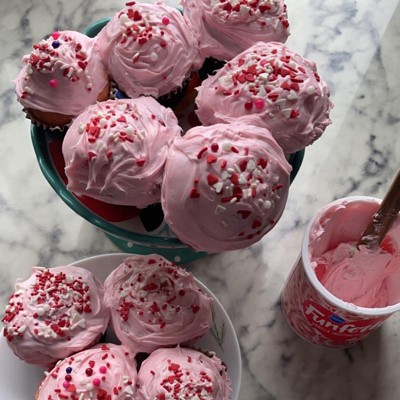 - Creamy, pink vanilla frosting with included heart-shaped sprinkles has a classic flavor that everyone will love