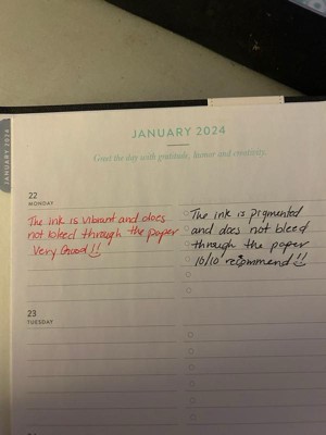 [This review was collected as part of a promotion.] The writing experience was extremely smooth; however, there are times when it can have friction if you write a certain way. The ink quality depending on the color is very rich, some more rich than others such as the blue and black vs the green. However, that could just be my preference. Very nice variety of colors; red and green are extra helpful. The comfort and grip of the pen is nice - it is sturdy and is just the right length, the pen is not too long or too short.