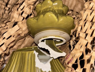 There were a lot of chips in the porcelain. It was packaged pretty well, so I can't say it was that. One of the chipped areas was a similar green, almost like someone went over the chip with a marker. Very weird. This item wasn't offered in my local store otherwise I wouldn't have picked shipping for such a fragile item.