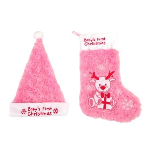 Perfect gift for the new baby boy in your life or as a gift for an upcoming baby shower. This soft plush Santa hat and stocking set in the perfect shade of blue has Baby's First Christmas stitched in quality embroidery on each item. Baby's first events are happy moments that are often memorialized forever with keepsakes such as bibs, clothes, and outfits that can help us reminisce about those treasured memories that can be shared with them as they grow. With the Baby's First Christmas Santa hat and socking set you'll have the perfect accessories for pictures, cards, gifts, or photo ornaments that will be on your holiday tree for years to come. The soft plush polyester of the hat and stocking is perfect for sensitive newborn skin.