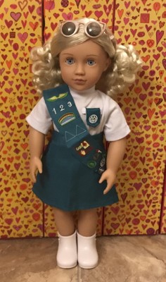 Brings back memories of my own Girl Scout Cadet days. My model is the too very cute Our Generation 18" doll. Which the uniform fit the doll very well. I do love these 18" outfit sets. They make for easy gifts for the kids. Lots of variety on line too. Some of the sleep sets with slippers and an stuff animal are too cute to pass up. No shoes or cap.