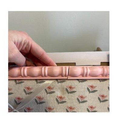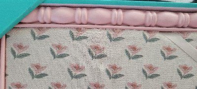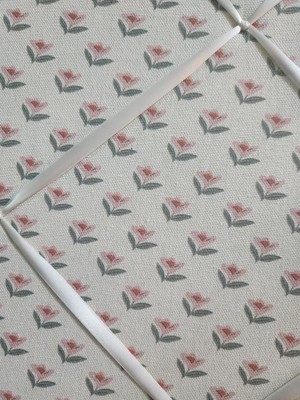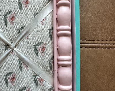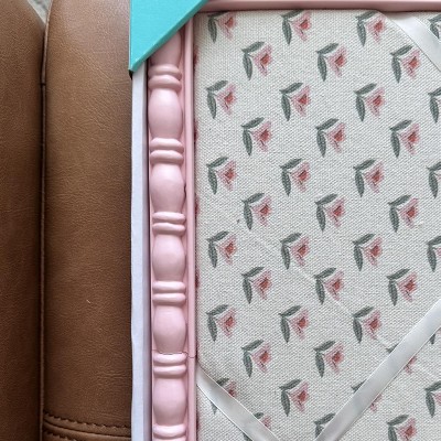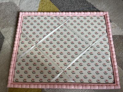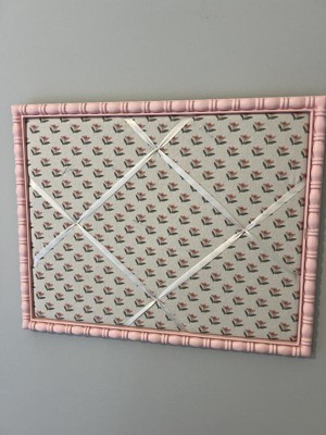A: The memo board features a floral print with a pink frame.