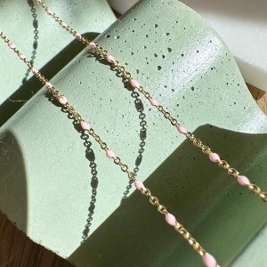 A rosary inspired chain necklace detailed with tiny, pink blush enamel dots. Wear it as a single strand, add your favorite charms, or alongside your favorite necklaces. Length: adjustable between 18"-21". Tiny 1.2mm enamel detailing.