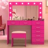 Enhance your beauty routine with this elegant Vanity Desk Set. Featuring a spacious lighted mirror with adjustable brightness and three color modes, this vanity provides the perfect lighting for any occasion. The sleek glass tabletop offers a chic, modern touch, allowing you to see all your essentials stored neatly below. With seven roomy drawers and a built-in charging station, you'll have everything you need right at your fingertips. Complete with a comfortable cushioned stool, this vanity is a luxurious addition to any bedroom or dressing area, making it the ultimate gift for beauty lovers.