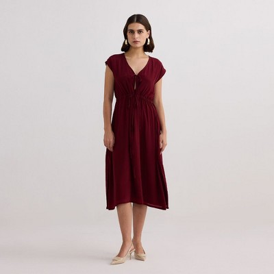 • A: The dress has short sleeves and a gathered front, providing a flattering and stylish look.