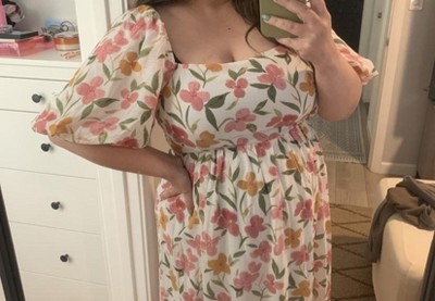A floral print maternity maxi featuring a squared neckline, short puff sleeves, a smocked back, side pockets, and a gathered hem. Dress is fully lined.
