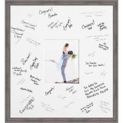 Preserve memories with this conservation-grade signature matboard and handmade frame. Double-thick matboard with a 7 inch width all around the opening holds 50-100 guest signatures and is protected with a UV-resistant sheet of framing acrylic, which shields your signatures and photo from harmful light damage more than traditional glass. Simply open the frame, remove the acrylic, place the mat in the frame for signing in order to assure signatures are fully visible, then replace the acrylic before hanging on the wall. Individually made using traditional custom framing techniques, it has the quality you would expect from your local frame shop and displays your keepsake with premium finishing that can be appreciated up close. BONUS MAT SAMPLE included to test different pens for use prior to signing. Choose pens carefully for fade resistance and the desired look.