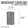 Merchant couplings are machined from rolled steel, making them the only fittings we offer that are crafted from the same industrial steel as our pipes. Manufactured to the same specifications as our other fittings, they provide the added strength and durability of steel. Hydrostatically tested, these couplings are ideal for decor as well as plumbing applications in air, gas, and liquid propane. Each coupling connects two pipes of the same diameter for a strong and sturdy extension. You will recognize PIPE DECOR parts and accessories the moment you hold them—beauty and beast, strength and style. These are real industrial fittings for your decorations and designs. Accept no substitutes. Extra pieces and accessories are available for custom projects and expansions. Plug and play as desired.
