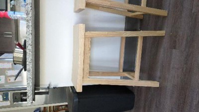 Very pretty, sturdy wood stools. Easy to build. Clearly made of solid wood. I also like the light finish