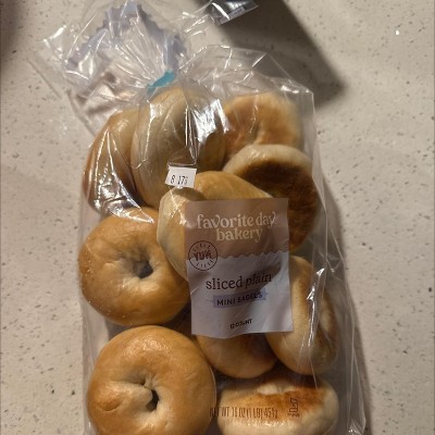 - Favorite Day Bakery plain mini bagels come 12 to a bag