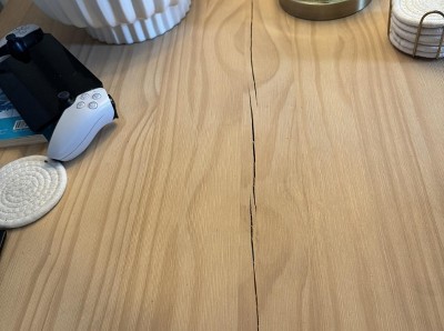 The table was delivered in September and by the end of December it had a gigantic crack down the middle. It lines up where grooves are cut in the underside, so I’m not sure if it was cut to close to the surface or the winter air was too dry? Either way it’s a bummer because everything else about it (color, size, etc.) was perfect.
