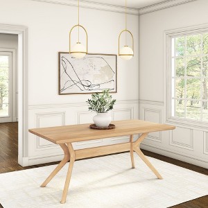Elevate your dining experience with the Verso Rectangular 72'' Dining Table, a masterful fusion of Scandinavian simplicity and mid-century modern flair. Designed to be the centerpiece of your dining area, this table exudes a refined elegance that complements any interior decor. Its distinctive cross-leg base introduces a touch of bohemian charm, setting a unique stage for intimate dinners, lively gatherings, and everything in between. Craftsmanship is at the heart of the Verso collection, where each piece is carefully constructed from high-quality materials. The table top, fashioned from solid pine, promises durability and showcases the natural beauty of wood grain. Supported by sturdy legs made from rubberwood, this table stands as a testament to sustainable design and construction practices. The combination of pine and rubberwood not only ensures stability and longevity but also adds a warm, natural feel to your dining space. The table undergoes a meticulous two step Lacquered finish process, which not only imparts a beautiful finish but also harmonizes with the matching hardware. This process highlights the table's natural beauty while ensuring it is safe for your home and loved ones. With dimensions of 72'' L x 35.75'' W x 30'' H, the Verso dining table offers generous space to accommodate your culinary creations, decorative centerpieces, and comfortably seats your guests. Its spacious tabletop provides the perfect canvas for your dining adventures, from casual breakfasts to festive dinners, without compromising on style or functionality. Assembly is streamlined and hassle-free, with clear instructions and all necessary components included. This ensures that you can easily bring the elegance and sophistication of the Verso Collection into your home with minimal effort. The Verso 72 Inch Dining Table is not just a piece of furniture but a statement of style and sustainability. It embodies a design philosophy that values simplicity, functionality, and beauty, making it an ideal choice for those who appreciate the timeless appeal of Scandinavian and mid-century designs. Invite the Verso dining table into your home and enjoy a blend of style, quality, and practicality that will enrich your dining experiences for years to come.