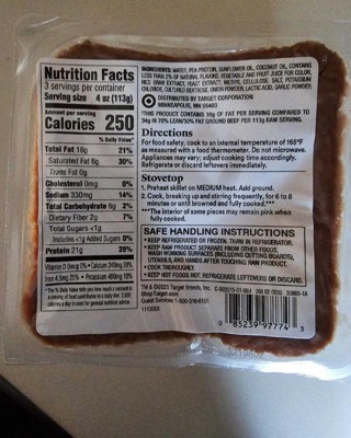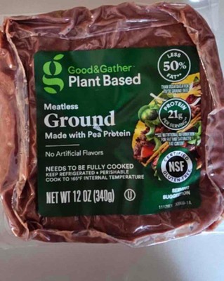 [This review was collected as part of a promotion.] I purchased this Good and Gather plant-based ground in a 12 ounce package. This meatless ground is made with pea protein and is equal to 21 grams of protein per serving. I made this package into four patties and grilled them. They tasted wonderful. I received an incentive to write this review.