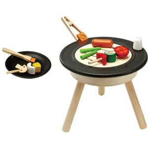 Gather around, and let’s barbecue! This set will boost a young chef’s imagination and social skills by preparing a meal with friends and family nearby. Children will also develop fine motor skills as they cook with fully functioning tools. This set includes 1 tong, 1 sauce brush, 1 pepper bottle, 2 skewers, 1 sausage, 2 stalks of asparagus, 1 halved tomato, 1 grilled beef wedge, 1 pineapple wedge, 1 onion, 1 mushroom, 1 zucchini, 1 bell pepper, 1 plate, 3 pieces of charcoal, 1 flame, and 1 stove with a removable lid. Remove the stove’s legs for a social dining experience. Combine this set with other PlanToys pretend foods and kitchenware to keep guests coming back for more!