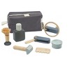 Spice up your morning routine with the PlanToys Shave Set! Let children pretend play shave just like they see their parents do in the morning. The set comes complete with a travel dopp kit, comb, knife, trimmer, bowl and brush, razor, mirror and aftershave bottle. This toy is the perfect addition to any childs pretend-play collection. Made sustainably in Thailand with reclaimed rubber wood.